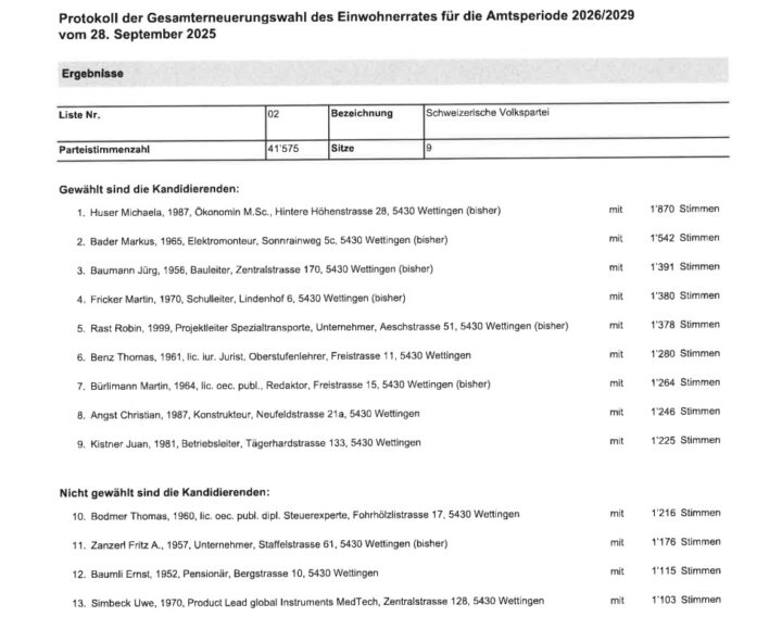 Die SVP Wettingen freut sich über das Wahlergebnis der Einwohnerratswahlen und bedankt sich bei der Bevölkerung für das entgegengebrachte Vertrauen.